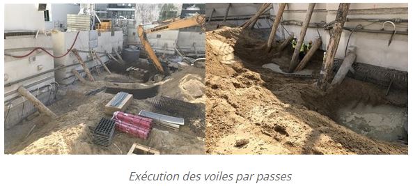 Nous avons par ailleurs mené une mission G3, Phase d’exécution dans le but de suivre la bonne exécution des voiles par passes et des fondations vis-à-vis des règles de l’art et de la présence de la nappe (suivi du rabattement).